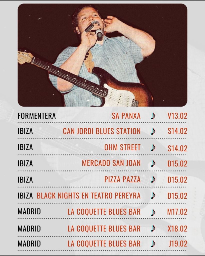 Desgarrando el blues tradicional con una voz potente e inconfundible que transmite el sentimiento más profundo de una música marcada por el sentimiento. Estará acompañado en todos los conciertos por David Barona y Christian Morana a la base rítmica y se repartirán las presentaciones Laura Solla en guitarra y Ángel Vera en armónica.